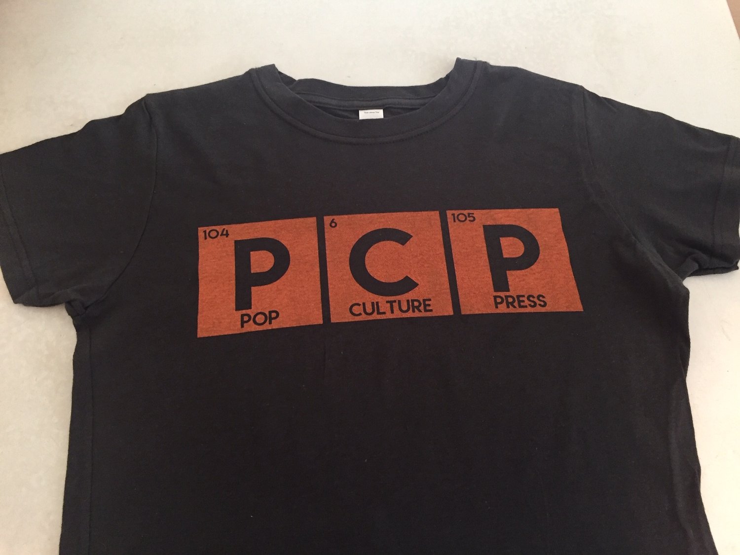 NOTE: Out of stock on Men's Large size. Get the atomic number for Pop Culture Press with this T-shirt! Charcoal with orange lettering.